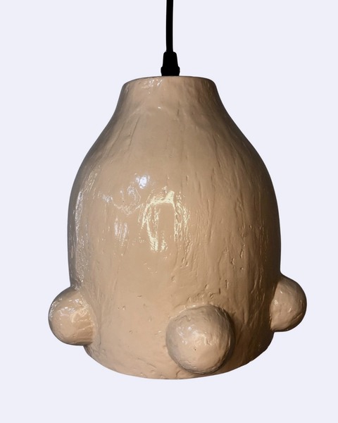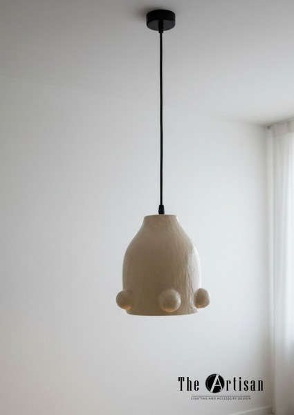 This pendant light is a hand-crafted form with a gently tapered silhouette and subtle organic texture. The matte, natural finish gives it a calm, earthy presence, while the rounded protrusions around the lower edge add detail. Suspended from a simple black cord, the piece balances raw materiality with clean restraint, making it feel at home in a warm Scandinavian interior, a modern kitchen, or a curated retail space. It can be used as a single pendant or clustered together.